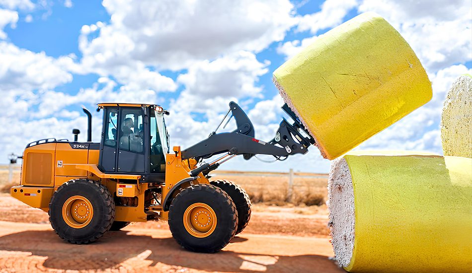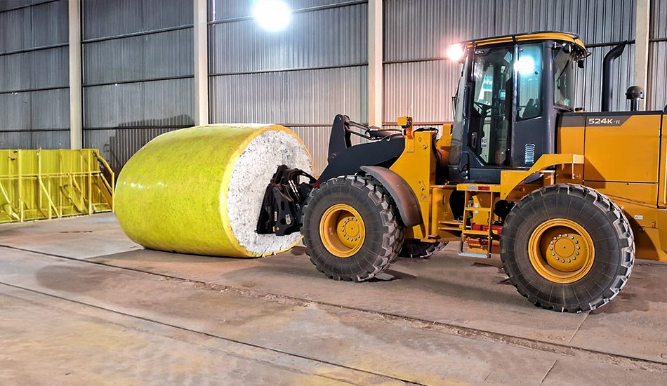 Eficiência no carregamento e descarregamento de fardos redondos de algodão.