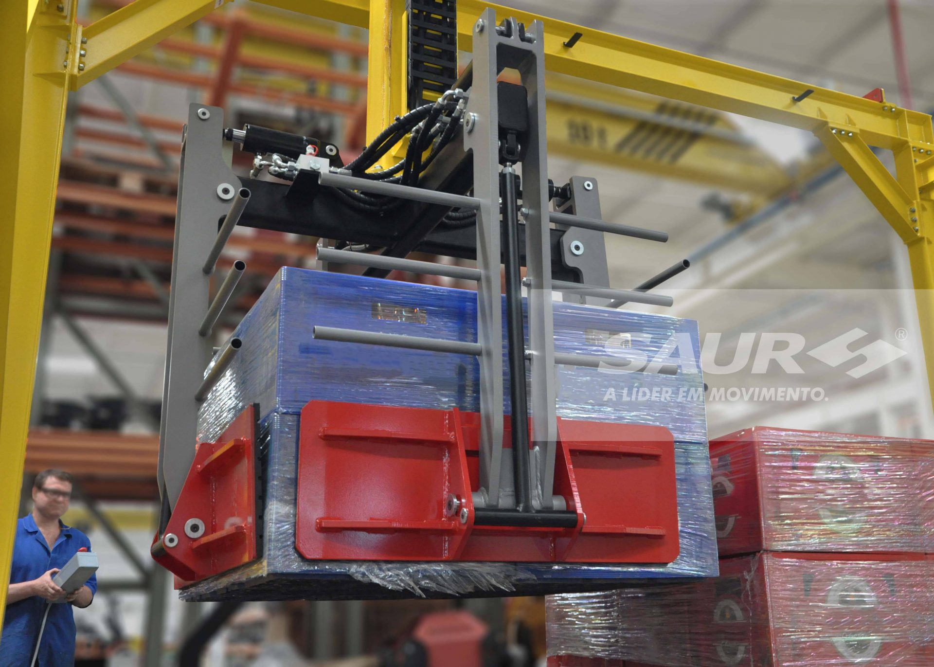 Facilita o manuseio de paletes com mercadorias mistas, eliminando a necessidade de empilhadeiras dedicadas e simplificando a movimentação.