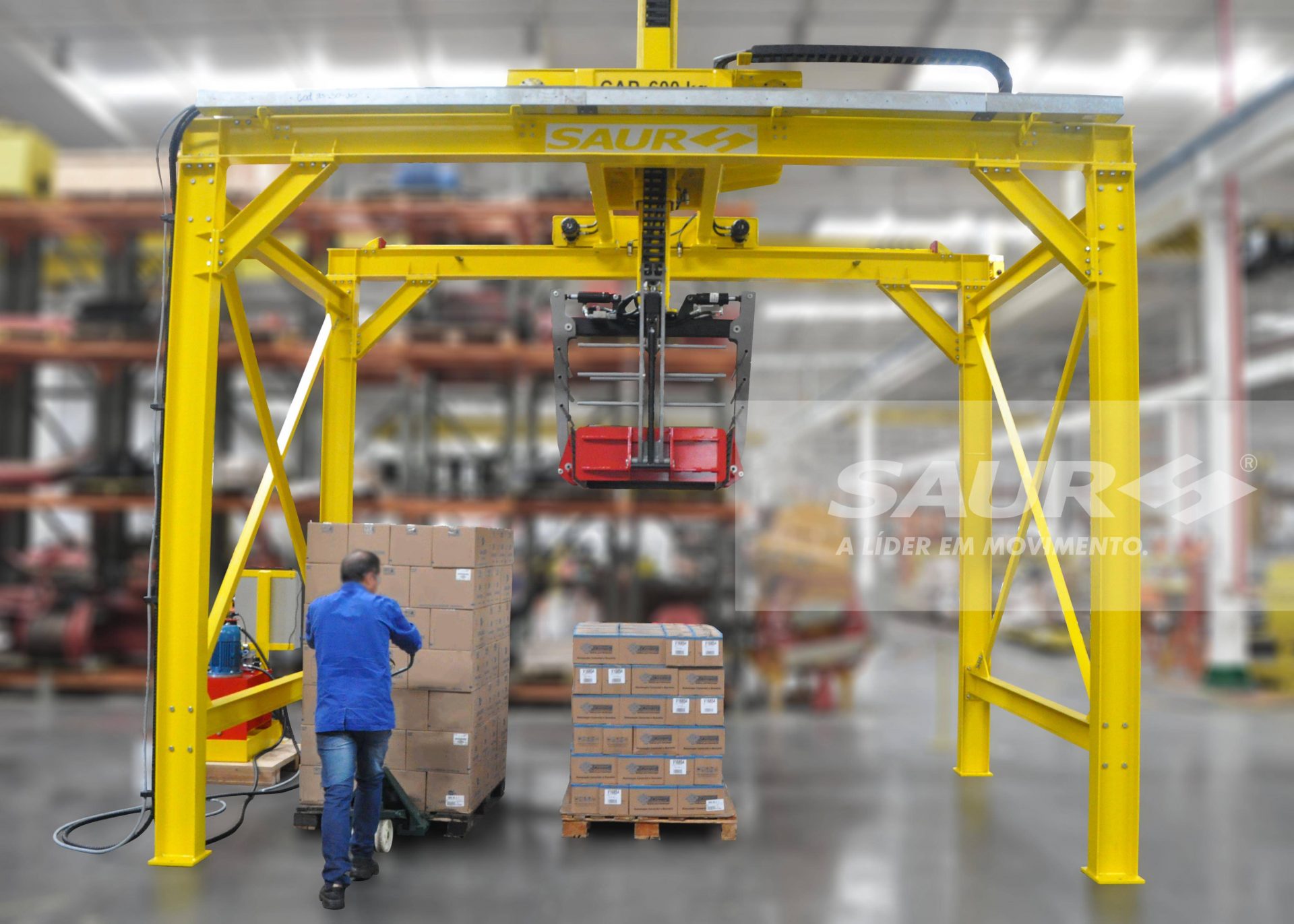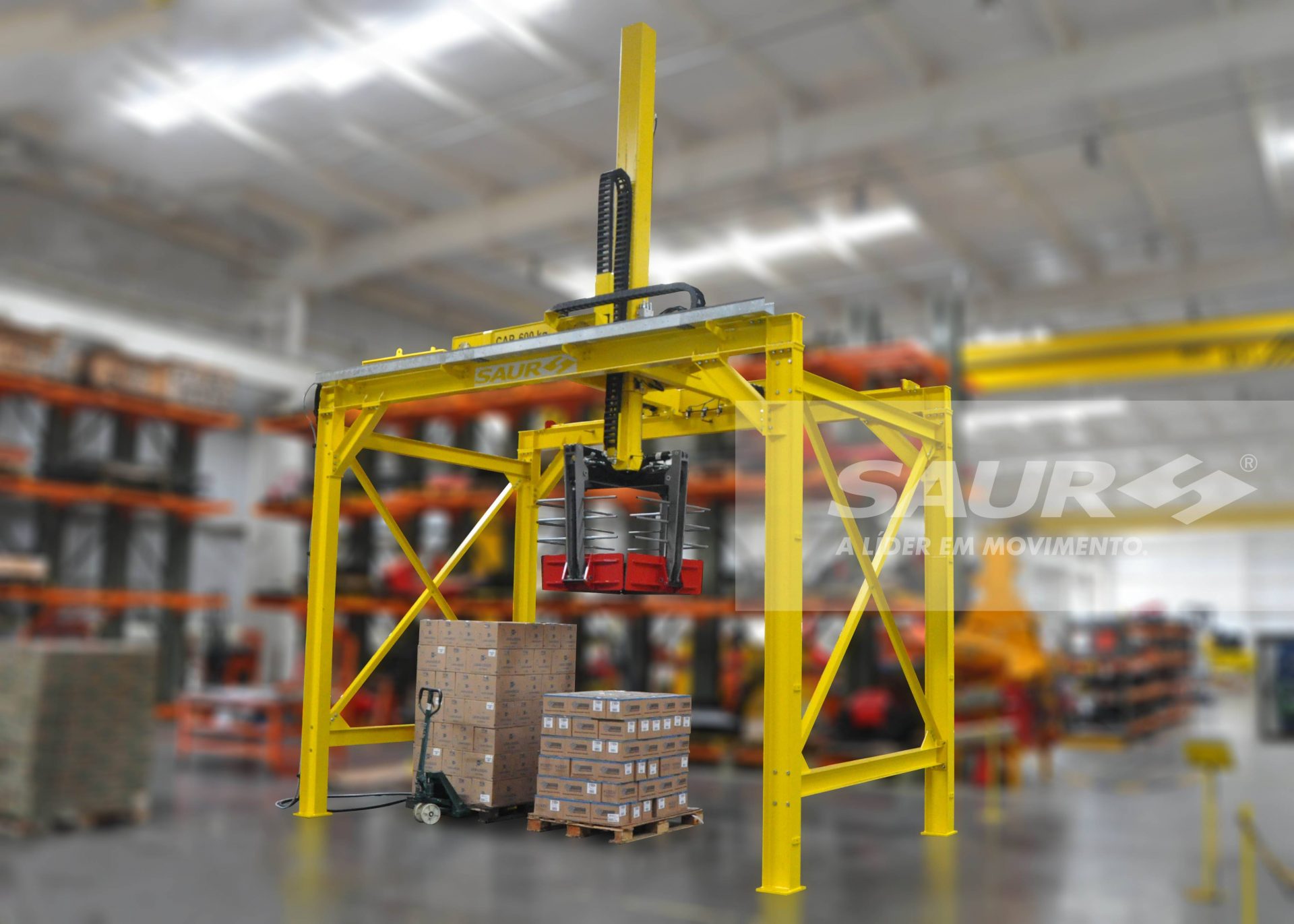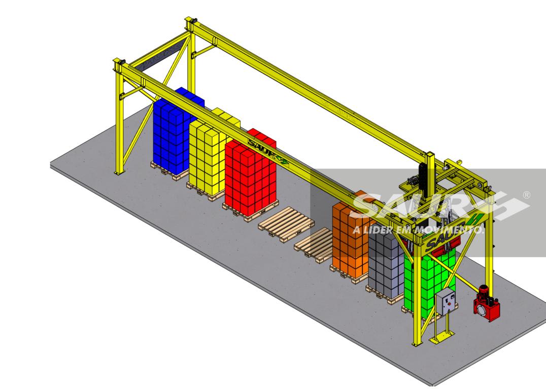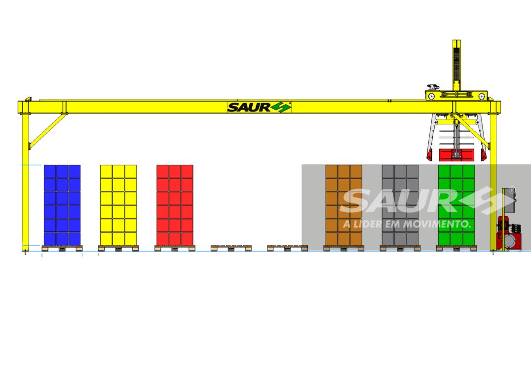 – Dimensões do Pórtico: 2.800 mm de largura x 1.200 mm de comprimento (capacidade para 8 posições de paletes).